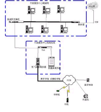 政府群眾一線通”系統(tǒng)可以通過局域網(wǎng)連入行政中心局域網(wǎng)交換機(jī),從而實(shí)現(xiàn)與整個(gè)行政服務(wù)中心的信息共享和熱線系統(tǒng)服務(wù)內(nèi)容的自動(dòng)更新。具體網(wǎng)絡(luò)拓?fù)浣Y(jié)構(gòu)如下: