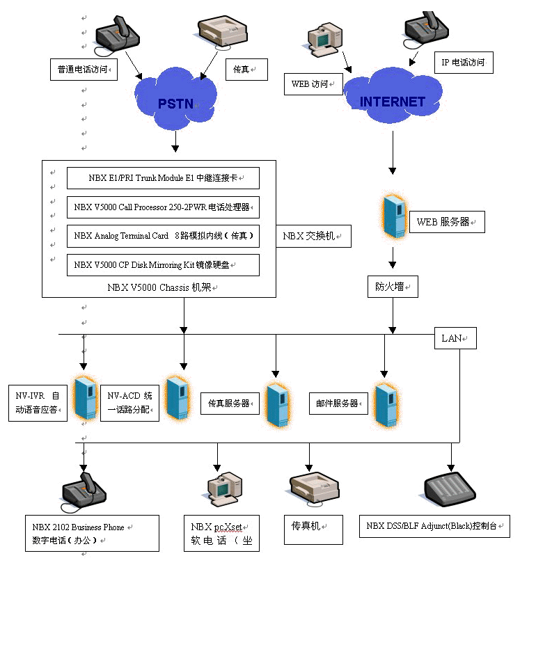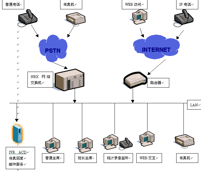 基于NBX的呼叫中心對外支持PSTN、IP兩種接入方式,可以實現(xiàn)各種接入:普通電話、傳真、IP電話、郵件、WEB訪問,NBX呼叫中心在技術上實現(xiàn)革命性的突破,在內部實行語音數(shù)據(jù)兩網(wǎng)合一,將外部的模擬數(shù)據(jù)轉換為以太網(wǎng)數(shù)據(jù)包,由NV-ACD實現(xiàn)外部各種訪問的統(tǒng)一路由分配。
