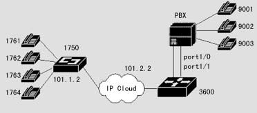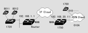 1720也可以通過(guò)器語(yǔ)音端口連接到PSTN,通過(guò)二次撥號(hào),使得兩地的PSTN用戶可以通過(guò)IP網(wǎng)絡(luò)互相通話,而話費(fèi)只是市話的費(fèi)用。