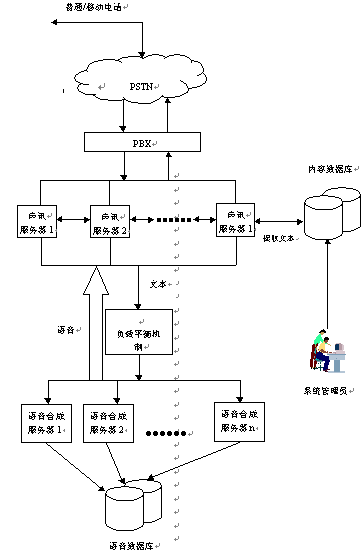 當(dāng)用戶通過電話向聲訊服務(wù)器發(fā)出請求時,聲訊服務(wù)器會首先作出分析判斷,然后從內(nèi)容數(shù)據(jù)庫中提取相應(yīng)的文本信息,經(jīng)過負(fù)載平衡機(jī)制發(fā)送給語音合成服務(wù)器。語音合成服務(wù)器在接收到文本后立刻開始合成,同時將合成好的語音發(fā)送回語音服務(wù)器,再由語音服務(wù)器回傳給用戶。其中內(nèi)容數(shù)據(jù)庫中的信息可以由系統(tǒng)管理員定期進(jìn)行維護(hù)管理。(系統(tǒng)連接結(jié)構(gòu)見流程圖)