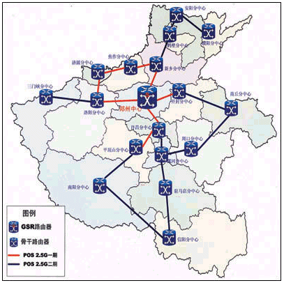 HERNET一期工程主干網(wǎng)采用IP POS技術(shù),應(yīng)用AVVID網(wǎng)絡(luò)體系結(jié)構(gòu),采用骨干傳輸網(wǎng)、城域網(wǎng)、接入網(wǎng)三層設(shè)計(jì)方案,以省網(wǎng)絡(luò)中心(設(shè)在鄭州大學(xué)網(wǎng)絡(luò)中心)、地市網(wǎng)絡(luò)中心、校園網(wǎng)三級管理模式。由省網(wǎng)絡(luò)中心向下以2.5G速度連接到各地市網(wǎng)絡(luò)中心,而向上則以155M速度連接到CERNET及Internet。整個(gè)一期工程實(shí)現(xiàn)了包括鄭州、許昌、平頂山、開封、洛陽、濟(jì)源、焦作以及新鄉(xiāng)等7個(gè)地市的2.5G連接,并形成了一個(gè)環(huán)網(wǎng)狀冗余拓?fù)浣Y(jié)構(gòu),確保當(dāng)網(wǎng)絡(luò)的一個(gè)節(jié)點(diǎn)出現(xiàn)問題時(shí),數(shù)據(jù)可以通過其他途徑傳輸?shù)侥康牡,在一期工程完成后,?0多所大學(xué)、中小學(xué)等教育與科研單位以千兆速度連接到HERNET上,共有近50萬的用戶能夠充分利用高速帶寬獲得教育網(wǎng)資源。