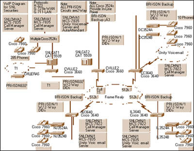 3524交換機(jī),它們能支持330多部思科IP 電話。各城市間的站點通過幀中繼WAN互相連接。在夏洛特斯維爾,3個基本速率接口(PRI)線路提供與公眾交換電話網(wǎng)(PSTN)的連接。由于SNL