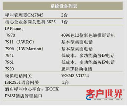 目前整個(gè)酒店IP電話系統(tǒng),采用兩個(gè)7845Call Manger,提供互相冗余備份。一套PMSI酒店管理接口,酒店呼叫中心平臺:IPCCX,兩臺ISR2851語音網(wǎng)關(guān)。酒店還為每個(gè)客房提供一部7970彩屏IP終端,同時(shí)為了顧客的方便還在床頭還提供一部7906或者7911IP電話終端,足見酒店的體貼周到。酒店辦公管理和客服中心分別使用7941和7961,同時(shí)為了移動方便,酒店還采用了Wi-Fi設(shè)計(jì),目前在酒店后臺管理采用了7920無線IP電話終端。