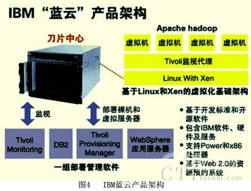 通過IBM的技術(shù)白皮書,我們可以一窺藍云計算平臺的內(nèi)部構(gòu)造!八{云”建立在IBM大規(guī)模計算領(lǐng)域的專業(yè)技術(shù)基礎(chǔ)上,基于由IBM軟件、系統(tǒng)技術(shù)和服務(wù)支持的開放標準和開源軟件。簡單地說,“藍云”基于IBM Almaden研究中心(Almaden Research Center)的云基礎(chǔ)架構(gòu),包括Xen和PowerVM虛擬化、Linux操作系統(tǒng)映像以及Hadoop文件系統(tǒng)與并行構(gòu)建!八{云”由IBM Tivoli軟件支持,通過管理服務(wù)器來確;谛枨蟮淖罴研阅堋_@包括通過能夠跨越多服務(wù)器實時分配資源的軟件,為客戶帶來一種無縫體驗,加速性能并確保在最苛刻環(huán)境下的穩(wěn)定性。IBM新近發(fā)布的“藍云(Blue Cloud)”計劃,能夠幫助用戶進行云計算環(huán)境的搭建。它通過將Tivoli、DB2、WebSphere與硬件產(chǎn)品(目前是x86刀片服務(wù)器)集成,能夠為企業(yè)架設(shè)一個分布式、可全球訪問的資源結(jié)構(gòu)。根據(jù)IBM的計劃,首款支持Power和x86處理器刀片服務(wù)器系統(tǒng)的“藍云”產(chǎn)品將于2008年正式推出,并且計劃隨后推出基于System z“大型主機”的云環(huán)境,以及基于高密度機架集群的云環(huán)境。