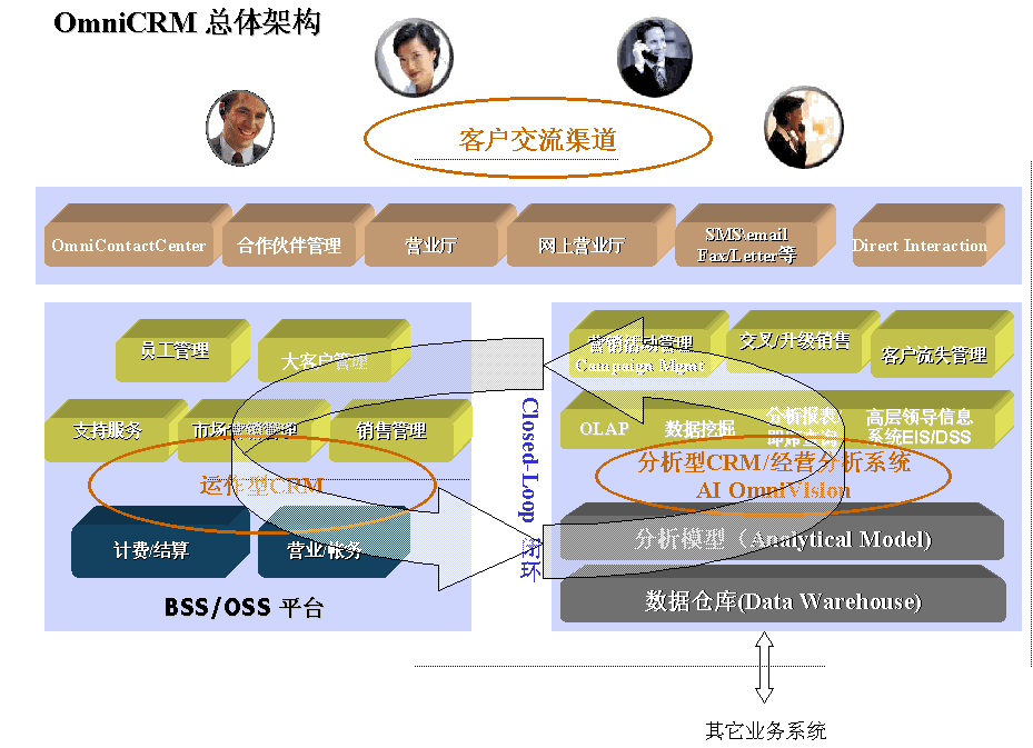 OmniCRM方案是亞信基于多年服務(wù)電信市場的豐富的行業(yè)經(jīng)驗,以及對國內(nèi)運營商業(yè)務(wù)發(fā)展的深刻認識而推出的,其中,AI OmniVision是OmniCRM方案中經(jīng)營分析型CRM 的核心產(chǎn)品。AI OmniVision不僅符合行業(yè)業(yè)務(wù)規(guī)范,而且基于對客戶行為、競爭環(huán)境,商業(yè)獲利率以及其他參數(shù)的透徹分析,能夠使運營商充分了解現(xiàn)有客戶、識別并關(guān)注贏利的客戶組、提高服務(wù)質(zhì)量、確?蛻魸M意度和忠誠度;同時吸引潛在的客戶;加強提供新服務(wù)的投資回報率;提高效率、減小成本,以實現(xiàn)業(yè)務(wù)價值的最大化。AI OmniVision采用數(shù)據(jù)倉庫、ETL、OLAP分析、靈活報表展現(xiàn)及數(shù)據(jù)挖掘等技術(shù),包含了用戶分析、業(yè)務(wù)分析、收益分析、大客戶分析、營銷分析、競爭分析、服務(wù)質(zhì)量、新業(yè)務(wù)分析等眾多功能模塊。