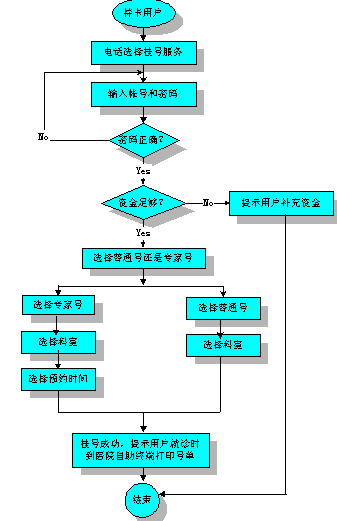 用戶連續(xù)三次輸入錯(cuò)誤,則服務(wù)終止。用戶輸入帳號(hào)密碼正確,則系統(tǒng)查詢用戶帳號(hào)上的資金,資金足夠,則系統(tǒng)繼續(xù)提示:"普通門(mén)診按1,專家門(mén)診按2"。