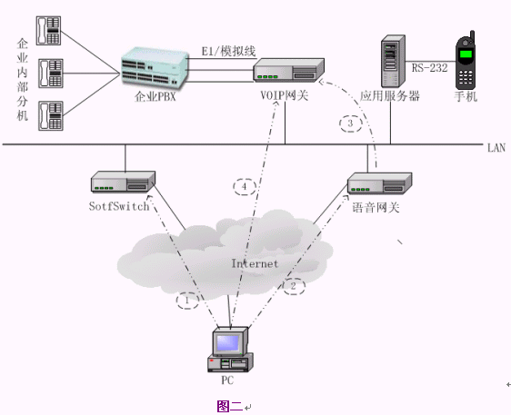 用戶使用系統(tǒng)時(shí),需要先下載終端并安裝到PC上,然后在終端上撥企業(yè)內(nèi)部的分機(jī)號(hào)碼就可以了。對于一般的企業(yè),VoIP語音網(wǎng)關(guān)可以配置幾條模擬線到一個(gè)E1的規(guī)模,SoftSwitch、語音網(wǎng)關(guān)、應(yīng)用服務(wù)器可以安裝在一臺(tái)PC或PC服務(wù)器上,或者與企業(yè)的其它服務(wù)器(如代理服務(wù)器)合用,另外需要一到兩個(gè)公網(wǎng)IP地址資源。系統(tǒng)的硬件和網(wǎng)絡(luò)成本非常低,整個(gè)系統(tǒng)如果按一個(gè)E1(30路)容量計(jì)算,配置VoIP網(wǎng)關(guān)和一臺(tái)PC服務(wù)器,硬件價(jià)格不超過3萬元,如果VoIP網(wǎng)關(guān)支持隧道模式傳送信令和語音,則語音網(wǎng)關(guān)也可以省去。