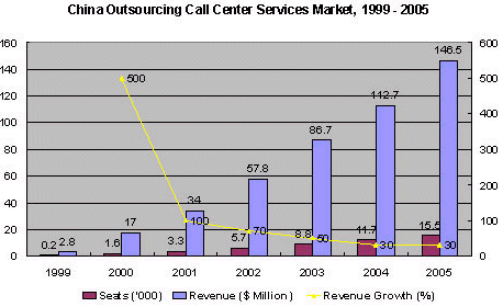 Frost & Sullivan公司研究表明在2000年,中國(guó)外包呼叫中心服務(wù)市場(chǎng)價(jià)值1700萬(wàn)美元,共有1600坐席。本座席數(shù)是按照實(shí)際工作量來(lái)計(jì)算的,物理上存在的坐席數(shù)要超過(guò)2300個(gè)。因?yàn)樵S多坐席是在2000年下半年末才建成投入使用的,并且工作任務(wù)也沒(méi)有滿負(fù)荷。