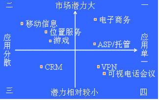 * 第三象限:市場潛力比較小,應用比較分散。由于經營靈活,貼近客戶,小服務提供商在此會有非常大的優(yōu)勢。大型運營商如想經營此象限內的業(yè)務,必須努力減小不同用戶需求的差異,并造成成本領先。如客戶關系管理(CRM)。