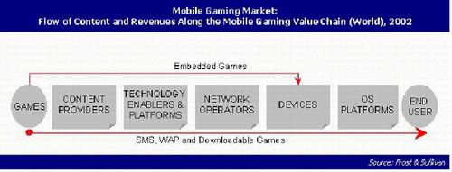 如果市場潛力足夠大,那么選擇適當的業(yè)務模式就是實現(xiàn)市場潛力的保證。而業(yè)務模式的選擇是與業(yè)務的市場價值鏈分不開的。在一些市場價值鏈較復雜的應用中,業(yè)務模式的選擇尤為重要,例如,下圖所示的移動游戲的價值鏈就是較復雜的一個: