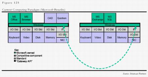 今天,由于業(yè)內(nèi)各企業(yè)普遍明白了控制價(jià)值鏈中操作平臺和應(yīng)用平臺的重要性,因此靠壟斷本身來贏利容易受到全行業(yè)的抵制,微軟的策略是在操作平臺和應(yīng)用平臺上形成壟斷后,靠應(yīng)用來贏利,這樣大大增加了贏利的隱蔽性,業(yè)界比較容易接受!