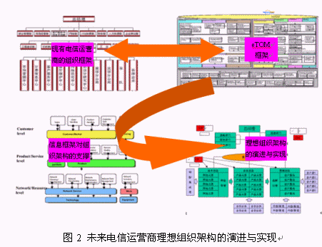 現(xiàn)有的電信運(yùn)營(yíng)商的管理架構(gòu)向理想的管理組織架構(gòu)演進(jìn)過(guò)程中,要涉及到不同的中間過(guò)程和步驟,對(duì)中間過(guò)渡狀態(tài)的評(píng)估和有效實(shí)現(xiàn),是實(shí)現(xiàn)演進(jìn)的關(guān)鍵,F(xiàn)有組織架構(gòu)管理職能的對(duì)應(yīng),業(yè)務(wù)流程的標(biāo)準(zhǔn)化,管理流程的標(biāo)準(zhǔn)化,企業(yè)IT支撐架構(gòu)對(duì)業(yè)務(wù)職能部門(mén)的支撐,這些環(huán)節(jié)都是運(yùn)營(yíng)商應(yīng)該重點(diǎn)考慮的中間內(nèi)容。圖2顯示了未來(lái)電信運(yùn)營(yíng)商理想組織架構(gòu)的演進(jìn)與實(shí)現(xiàn)過(guò)程。其中的任何一個(gè)環(huán)節(jié)都是電信運(yùn)營(yíng)管理研究的核心課題,也直接影響到了電信運(yùn)營(yíng)管理變革的成敗。