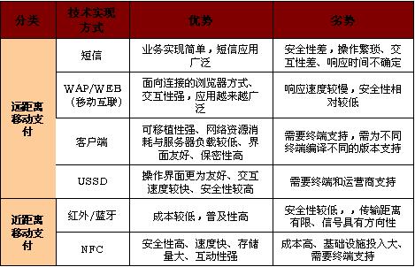移動支付(Mobile payment)包括遠距離方式和近距離方式。遠距離移動支付的主要技術實現(xiàn)方式有SMS、WAP、客戶端(手機軟件)和USSD;近距離移動支付的主要技術實現(xiàn)方式有紅外和NFC。各種移動支付業(yè)務技術實現(xiàn)方式優(yōu)劣勢比較詳見圖表1。
