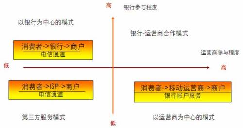 從產(chǎn)業(yè)鏈環(huán)節(jié)上看,移動支付的主要參與者主要包括:消費者、平臺提供商、銀行、運營商和商戶。其中,銀行和運營商在其中具有較高的談判能力。因此,可以按照這兩者在產(chǎn)業(yè)鏈中的參與程度,劃分移動支付的商業(yè)模式。總的來說,銀行機構管理著廣大用戶的資金帳戶,擁有完善的支付體系,在支付領域具有天然的用戶信任。運營商則擁有完備的網(wǎng)絡設施和先進的IT系統(tǒng),通過定制終端,運營商可以將各種先進的移動應用提供給用戶,使用戶獲得良好的移動化生活體驗。因此,運營商在這方面具有較好的用戶資源和營銷渠道。