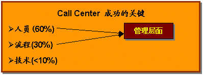 企業(yè)必須牢記在心,成功運營呼叫中心的三要素 人員、流程和技術,三項缺一不可,而更重要的是如何適當?shù)卣线@三項要素。鑒于以往經驗,呼叫中心的成功與否,人的因素占60%,流程因素占30%,而技術因素只占10%。這并不表示可以忽視技術的重要性,技術一樣很重要。如果沒有當今日新月異的科技,企業(yè)便無法實現(xiàn)呼叫中心的運營;而成功地實現(xiàn)呼叫中心有效的管理與運營,關鍵在于管理能力,也就是對人員及流程的把握。