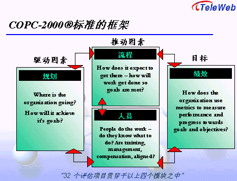 COPC-2000®標準提供呼叫中心規(guī)劃與領導、流程管理、人員管理、績效考核四大類32項指標的評估基準,內(nèi)容涵蓋財務成本、客戶滿意度、客戶投訴、服務與質(zhì)量、組織結構、人力資源運用、員工考核及士氣等呼叫中心管理的所有方面。具體架構見下圖。