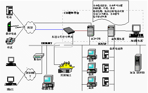 電信1000號客戶服務(wù)中心,集成了計算機(jī)網(wǎng)絡(luò)技術(shù)和計算機(jī)語音集成技術(shù)(CTI)。系統(tǒng)結(jié)構(gòu)可分為三部分:CTI硬件平臺、LAN網(wǎng)絡(luò)平臺、客戶服務(wù)軟件系統(tǒng)。東進(jìn)公司推出了基于板卡的CTI硬件方案,以七號信令網(wǎng)關(guān)進(jìn)行協(xié)議轉(zhuǎn)換。此硬件平臺具有以下優(yōu)點: