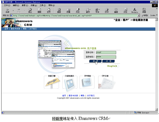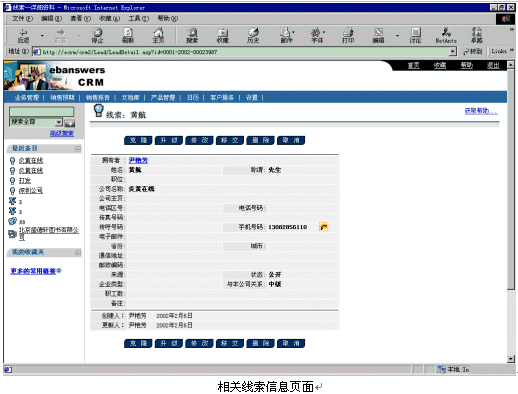 Ebanswers CRM系統(tǒng)去激活相關客戶資料的IE頁面進行處理:如果此號碼數據庫中存在,則顯示此人的信息,如果不存在,則顯示CRM中添加新線索的頁面。而Ebanswers