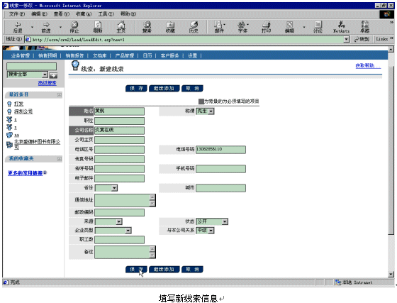 。。比如現(xiàn)在有一個新客戶黃航的電話13082856110呼入Ebanswers呼叫中心,console控制臺接收到這個電話號碼以后,會產生一個URL鏈接地址tel=217,以參數的形式附在調用的CRM頁面http://ecrm/crm2/default.asp?retURL=http://ecrm/crm2/search/searchtel_xml.asp后面,當話務員登錄以后,就會彈出相應的添加新線索頁面,話務員填寫好相關信息后,按下"保存"按鈕就可以建立新線索了。