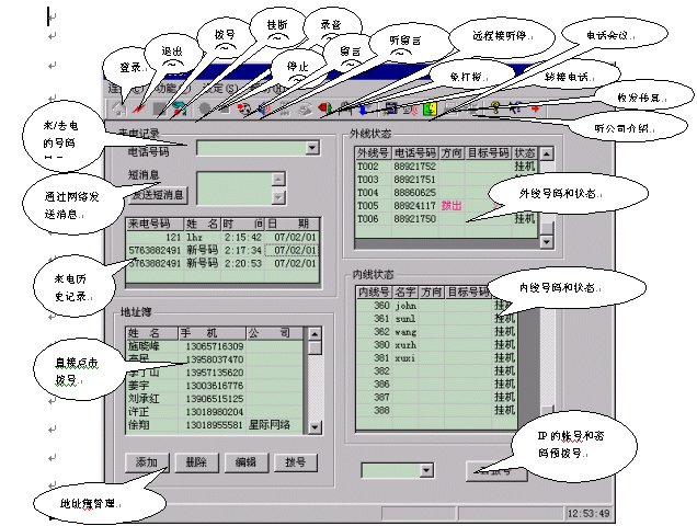 電話控制臺(tái)(軟電話),所有系統(tǒng)操作包括電話、查詢、短消息等等都可以通過(guò)鍵盤、鼠標(biāo)操作完成: