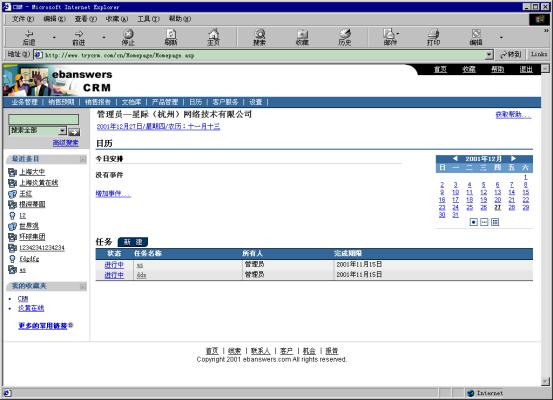 星際(杭州)網(wǎng)絡(luò)技術(shù)有限公司(www.ebanswers.com)研發(fā)的Ebanswers eCRM是中國(guó)第一套基于新一代網(wǎng)絡(luò)標(biāo)準(zhǔn)語(yǔ)言――XML的客戶關(guān)系管理系統(tǒng),整個(gè)系統(tǒng)提供了完善的企業(yè)級(jí)客戶關(guān)系全面解決方案,包含可無(wú)縫整合又可獨(dú)立運(yùn)行的三個(gè)功能組件:銷(xiāo)售,營(yíng)銷(xiāo),服務(wù)流程自動(dòng)化軟件系統(tǒng);客戶溝通集成信息化方案;深層商業(yè)智能分析。