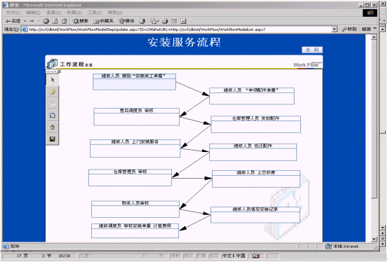 工作流程是指企業(yè)或公司的某種工作按照特定規(guī)范的流程在計(jì)算機(jī)上實(shí)現(xiàn)流轉(zhuǎn)的過(guò)程,工作流程由步驟、行為、行為處理、崗位的設(shè)置、權(quán)限設(shè)置等基本元素組成,主要對(duì)維修和回訪(fǎng)的流程進(jìn)行管理。