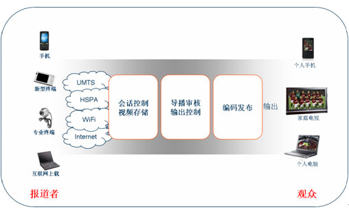 如今手機(jī)能拍照、攝像并不稀奇,攝像頭幾乎成了手機(jī)的標(biāo)準(zhǔn)配置,視頻通話也是3G特色業(yè)務(wù)之一,但要把手機(jī)拍攝的圖像實(shí)時(shí)回傳到電視臺(tái),并合理地發(fā)送到直播節(jié)目中卻還需要打通很多環(huán)節(jié)。總的來說,電視臺(tái)需要的是一個(gè)業(yè)務(wù)控制平臺(tái),使后臺(tái)導(dǎo)播人員能監(jiān)控、審核手機(jī)回傳的多路視頻信號(hào),根據(jù)需要選取其中的合適內(nèi)容插入到直播節(jié)目中,同時(shí)系統(tǒng)還應(yīng)該能夠根據(jù)需求同時(shí)輸出各種格式的視頻,發(fā)布到電視頻道、互聯(lián)網(wǎng)或者手機(jī)電視中。