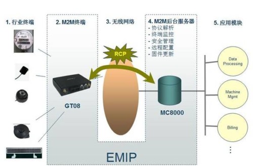 所有的M2M方案都具有的五要素是行業(yè)終端、M2M終端、無線傳輸網(wǎng)絡(luò)、M2M后臺(tái)服務(wù)器以及應(yīng)用模塊。為了能快速有效及低成本地適應(yīng)M2M市場(chǎng)上各種各樣的行業(yè)應(yīng)用,愛立信提出智能平臺(tái)EMIP的概念(如圖所示)。該智能平臺(tái)由GT08系列終端和MC8000管理服務(wù)器組成。