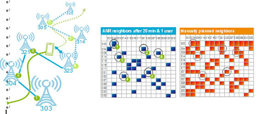 ANR盡管目前在LTE還沒有商用,但在多個(gè)歐美運(yùn)營商的測(cè)試中,愛立信產(chǎn)品表現(xiàn)良好。如下圖ANR測(cè)試中,僅使用一個(gè)移動(dòng)終端在20分鐘內(nèi)通過了20個(gè)基站覆蓋區(qū)域,檢測(cè)到的鄰區(qū)關(guān)系如藍(lán)圖所示,相比橙色圖的手工配置鄰區(qū),所有必要的鄰區(qū)關(guān)系(有數(shù)字標(biāo)示)悉數(shù)獲得。而且這僅僅動(dòng)用了一個(gè)終端,如果相關(guān)區(qū)域內(nèi)都有終端分布,檢測(cè)的速度會(huì)有極大提高。
