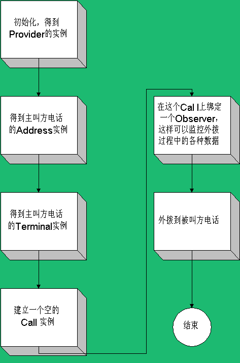 下面提供一個簡單的軟電話外撥程序代碼。代碼分為“外撥”模塊,以及“監(jiān)控”模塊。這兩個模塊分別和前文提到的“ 客戶端主動調(diào)用后臺PBX資源”,以及“客戶端對后臺資源傳來的電話消息進行分析”相對應(yīng)。通過對這個例子的分析,我們可以很快掌握利用JTAPI開發(fā)CTI應(yīng)用程序的基本思想。
