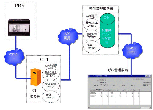 一般來說,各大有能力推出PBX產(chǎn)品的通訊廠商都有自己專用的呼叫管理系統(tǒng)。這些專用的呼叫管理系統(tǒng)可以直接從PBX獲取最高效的消息,而不用通過CTI SERVER。當然,這些專用的呼叫管理系統(tǒng)也只能應用于專門的PBX產(chǎn)品。 如果運營商在選購設備的時候,已經(jīng)選購了專用的呼叫管理系統(tǒng),那么開發(fā)商可以對這個專門的呼叫管理系統(tǒng)進行二次開發(fā)。請看下面的數(shù)據(jù)流程圖:
