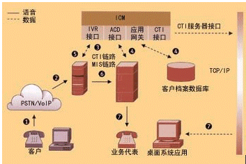CTI (Computer Telephony Integration 計算機(jī)電信集成) 技術(shù)將計算機(jī)網(wǎng)和電話網(wǎng)連接在一起,把語音和數(shù)據(jù)服務(wù)集成為一體,使得構(gòu)造數(shù)據(jù)和語音的融合應(yīng)用得以實現(xiàn)。例如,由于CTI技術(shù)的引入,當(dāng)用戶來話時,呼叫中心能根據(jù)用戶的呼叫信息如ANI(主叫號)結(jié)合數(shù)據(jù)庫迅速地識別用戶,實現(xiàn)“彈屏”功能;當(dāng)電話轉(zhuǎn)接時,實現(xiàn)語音數(shù)據(jù)的同步轉(zhuǎn)移;根據(jù)所獲得的客戶信息及其他相關(guān)信息將來話路由到最適合服務(wù)的座席等。CTI技術(shù)包含了數(shù)據(jù)通信與語音通信兩大部分的內(nèi)容,關(guān)注的不僅僅是將基于計算機(jī)的智能技術(shù)運(yùn)用到電話的發(fā)送、接收及管理,還要考慮各種媒體類型的信息傳送,包括實時信號和非實時信號,如傳真、電子郵件和視頻信號等。