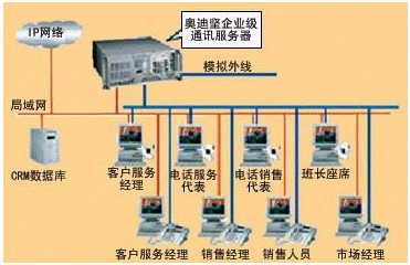 * 小型呼叫中心:座席數(shù)目在50個以下。投資一般在50萬元以下。這種系統(tǒng)結(jié)構(gòu)與第二種類似,但使用較小型PBX,或用板卡代替,業(yè)務(wù)代表座席、應(yīng)用服務(wù)器及數(shù)據(jù)庫大小在量上均作相應(yīng)減少,它主要適合中小型企業(yè)的業(yè)務(wù)需要。