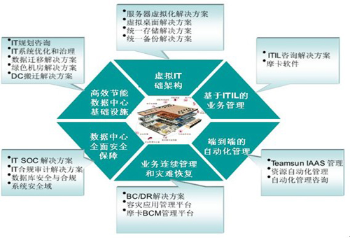 圍繞云計算數(shù)據(jù)中心的建設(shè),華勝天成共開發(fā)了多個解決方案,且每個解決方案均有專業(yè)的售前支持團(tuán)隊和售后實施團(tuán)隊,這些解決方案不是分散而無關(guān)的,而是針對用戶的不同情況,在各方面均給予綜合考慮,以最優(yōu)的設(shè)計方案來滿足用戶的需要,并兼顧另外方面的后繼需求。