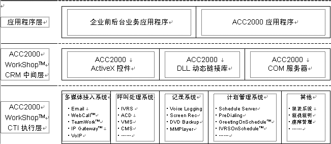 ACC2000 Workshop是聲訊科技集團(tuán)為基于Microsoft Windows操作系統(tǒng)的CRM應(yīng)用軟件開發(fā)所建立的開發(fā)平臺(tái)(中間件)。以ACC2000 Workshop為基礎(chǔ)的ACC2000集成多媒體溝通中心采用三層結(jié)構(gòu),利用ACC2000 Workshop的CRM中間層所提供的ActiveX控件、DLL動(dòng)態(tài)庫以及COM組件,就可以很容易地將溝通中心的各種功能融合到前端應(yīng)用程序中。ACC2000 Workshop的CTI執(zhí)行層接受中間件發(fā)來的請(qǐng)求,處理ACC2000的各項(xiàng)服務(wù)功能,并向CRM應(yīng)用程序返回執(zhí)行結(jié)果。見下圖。