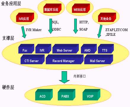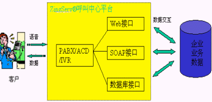 SQL Server,MySQL等多種數(shù)據(jù)庫(kù);通過HTTP調(diào)用第三方WEB程序,通過SOAP協(xié)議調(diào)用Web Server上的服務(wù),從而利用外部應(yīng)用進(jìn)一步加強(qiáng)IVR的功能;用戶只需做一些簡(jiǎn)單配置就可以實(shí)現(xiàn)電話訪問數(shù)據(jù)庫(kù)、WEB和業(yè)務(wù)系統(tǒng)。如圖所示: