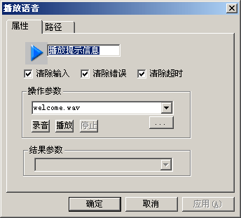 并不是所有的模塊都有操作參數(shù)和結(jié)果參數(shù),有些模塊可能只有其中的一個(gè),有些模塊兩個(gè)參數(shù)都沒(méi)有。例如:播放語(yǔ)音模塊必需有操作參數(shù)--要播放的語(yǔ)音文件的文件名,但它沒(méi)有結(jié)果參數(shù);存儲(chǔ)變量模塊必需有結(jié)果參數(shù)--變量名,但它沒(méi)有操作參數(shù);運(yùn)算模塊既有操作參數(shù),也有結(jié)果參數(shù);取消轉(zhuǎn)隊(duì)列模塊和退出模塊則沒(méi)有參數(shù)。