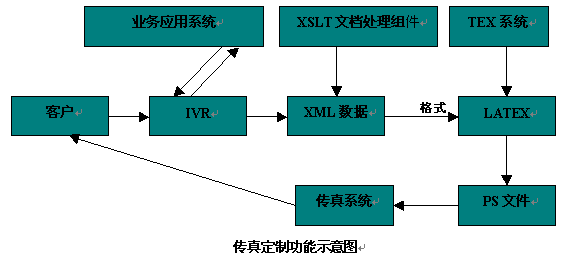 用戶通過IVR與業(yè)務(wù)應(yīng)用系統(tǒng)交互,獲得所需的傳真數(shù)據(jù),這些傳真數(shù)據(jù)在系統(tǒng)中以XML數(shù)據(jù)的格式存在,系統(tǒng)然后調(diào)用XSLT(英文縮寫,XSLT是語(yǔ)言,專門處理XML數(shù)據(jù),通過一段XSLT程序可以將XML數(shù)據(jù)轉(zhuǎn)換成其他的形式的文檔,如HTML,LATEX文檔,從而用來顯示XML數(shù)據(jù)給人們閱讀)文檔處理組件對(duì)XML數(shù)據(jù)處理,處理結(jié)果是LATEX(LATEX是TEX系統(tǒng)增加了一些宏指令的增強(qiáng),TEX系統(tǒng)是一個(gè)計(jì)算機(jī)排版系統(tǒng),
