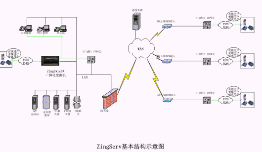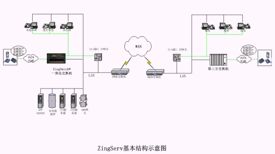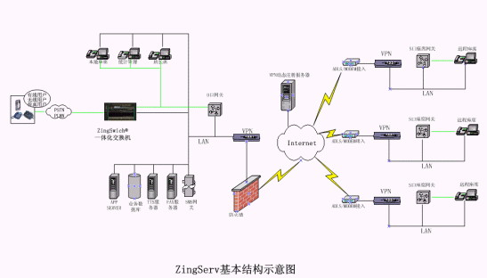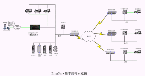 硬件:坐席集中的中心點都有ZingSwitch®交換機,S口網(wǎng)關(guān)和CO8卡或E1接口網(wǎng)關(guān)和E1卡。VPN動態(tài)注冊服務器和VPN設(shè)備,或GK服務器。