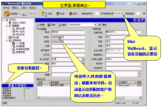 當客戶的電話被轉(zhuǎn)到客戶服務(wù)人員時,客戶的所有相關(guān)信息將自動彈出顯示在服務(wù)人員的電腦屏幕上,包括歷史接觸記錄信息等,這樣就能提供最具有針對性和高效率的服務(wù)。如果是新客戶,那么服務(wù)人員將即時錄入信息,動態(tài)擴充數(shù)據(jù)庫。