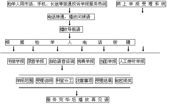 本系統(tǒng)充分借助計算機(jī)及通迅線路的優(yōu)勢,將高度普及的電話線路,同高科技的計算機(jī)處理緊密結(jié)合起來,通過電話語音這一人類最易溝通交流的途徑和手段,將檢舉人和檢察院緊密結(jié)合起來。檢舉人通過簡單的拔通服務(wù)電話,使用電話按鍵,利用自動語音導(dǎo)航和人工服務(wù),實現(xiàn)以上熱線投訴舉報的自動咨詢及人工服務(wù)的各項功能。