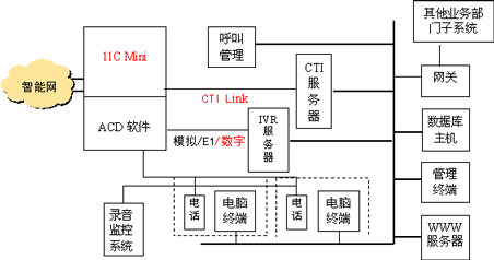在我國中小企事業(yè)單位的熱線系統(tǒng)中,由于受呼叫中心的規(guī)模和投資影響,許多小型呼叫中心還是采用基于語音板卡的呼叫中心解決方案。為了滿足中小企業(yè)采用先進的基于北電Meridian1交換機的呼叫中心解決方案,我公司在深入研究國內(nèi)呼叫中心市場基礎上,采用基于北電網(wǎng)絡Meridian 1交換機的CTI  Link軟件,結(jié)合北電Meridian 1 Option 11C mini交換機和強大的Meridian ACD軟件包,推出小型呼叫中心解決方案,它采用靈活的、可擴展的Client/Server結(jié)構(gòu),利用Meridian 1多媒體集成技術(shù),將傳統(tǒng)電話、電子郵件、因特網(wǎng)、傳真、Video等媒體集成在一起,提供高效的ACD(自動來話分配)、用戶可控隊列CDN、技能路由選擇等先進的路由技術(shù),使用戶以較小的投資,就能領略先進的呼叫中心解決方案,具有極高的性能價格比,符合中小企業(yè)的財政預算,受到廣大系統(tǒng)集成和應用軟件開發(fā)商和直接用戶的歡迎和高度評價。