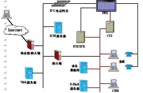AllCom ICC呼叫中心采用開放的和可擴展的體系結構,通過高度靈活的系統(tǒng)平臺,為客戶提供Internet多媒體的接入方式。圖中右側是傳統(tǒng)呼叫中心部分,左側為Internet呼叫中心所特有的,其中關鍵部件為Internet呼叫管理(ICM)和IP電話網(wǎng)關(ITG)。