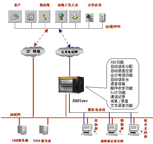 奧迪堅(jiān)呼叫中心平臺(tái)在一臺(tái)服務(wù)器(AltiServ)上整合了所有常用呼叫中心的功能,并提供與CRM軟件的接口平臺(tái),從而真正提升客戶(hù)滿(mǎn)意度,提高企業(yè)本身的盈利能力。