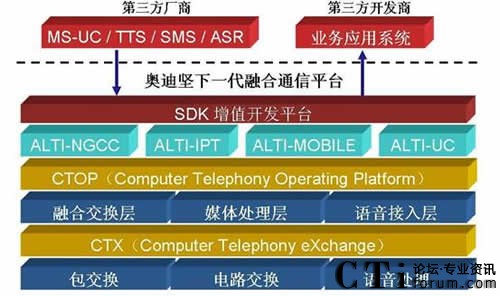 其次,提供業(yè)界領先的CTOP(Computer Telephony Operation Platform)平臺架構,提供三層架構,實現融合交換層,媒體處理層和語音接入層,融合交換層實現IP-PBX、ACD、CTI、IVR、CDR、Voice Mail及系統(tǒng)管理等核心功能;媒體處理層實現IP語音媒體處理功能 ,實現對IP語音通道的通話錄音、基礎IVR等功能,實現會議及監(jiān)控資源等功能;語音接入層,實現外線接入、分機連接等傳統(tǒng)語音網關功能,實現對PSTN外線和模擬分機的通話錄音、基礎IVR等功能 。
