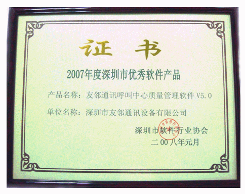 2008年3月14日,深圳市友鄰通訊設(shè)備有限公司(以下簡稱“友鄰通訊”)宣布,公司主打軟件產(chǎn)品“友鄰通訊呼叫中心質(zhì)量管理軟件V5.0”(即 AP Suite 呼叫中心質(zhì)量管理系統(tǒng)V5.0)榮獲深圳市軟件行業(yè)協(xié)會“2007年度深圳市優(yōu)秀軟件產(chǎn)品”榮譽稱號。