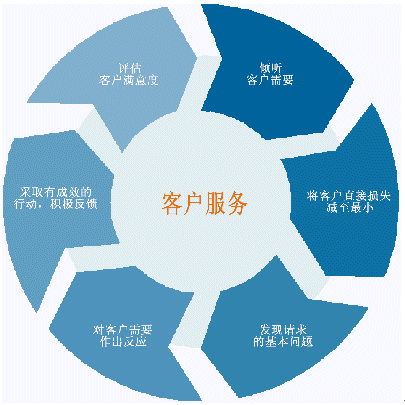 客戶服務(wù)不僅限于把公司提供給客戶使用?蛻舴⻊(wù)是與客戶交互的一個(gè)完整過(guò)程,包括聽(tīng)取客戶的問(wèn)題和要求,對(duì)客戶的需要作出反應(yīng)并探詢(xún)客戶新的需求。我們真的不能將其看成一個(gè)簡(jiǎn)單的過(guò)程?蛻舴⻊(wù)可以用一個(gè)復(fù)雜的循環(huán)來(lái)表示,其中不僅僅包括了客戶和客戶服務(wù)部門(mén),實(shí)際上包括了整個(gè)公司,即把公司整體作為一個(gè)受客戶需求驅(qū)動(dòng)的對(duì)象。