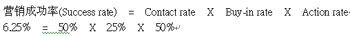 rate(接觸率,能夠聯(lián)系到客戶的比率), Buy-in rate(接受率,聯(lián)系到的客戶里面表達(dá)有興趣的比率), Action rate(成交率,表達(dá)有興趣的客戶里面真正付錢購買的比率)。一般而言,接觸率能達(dá)到50%算是不錯(cuò)的名單,而接受率能達(dá)到25%算是產(chǎn)品、名單選擇登對(duì),銷售技巧也到位,最后臨門一腳的成交率應(yīng)該要能到50%算是達(dá)標(biāo)了。以下列公式來表達(dá)(標(biāo)準(zhǔn)以上述的比率套用):
