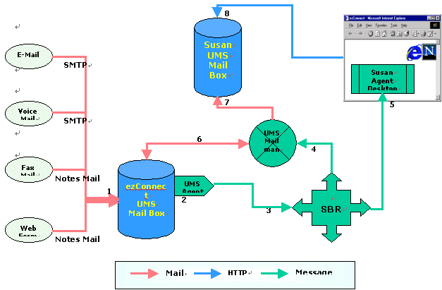 各類外部語音、郵件、WEB、傳真等信息進入呼叫中心會以相應的格式直接被放入ezConnect統(tǒng)一郵件服務器(1),消息經(jīng)過UMS Agent 模塊被提取出信息主題和關(guān)鍵字(2),這些主題和關(guān)鍵字被送入基于技能的路由選擇模塊SBR(3),由SBR進行分析,選擇出最合適服務的座席(例如是Susan);之后SBR通知郵件轉(zhuǎn)發(fā)器(4)去ezConnect統(tǒng)一郵件服務器中取相應的郵件(6),將郵件放入最佳座席(Susan)的UMS信箱中(7)(8),與此同時座席Susan的界面上顯示出她有一封新的郵件(5)。至此,完成了座席Susan 接收UMS信件的全過程。