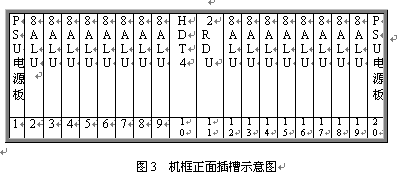 見圖2和3,遠端模塊采用19英寸標準機框,高度為5U,可安裝在各種標準的19英寸的機柜中。機框共20個插槽,正面插板,反面背板出線。每個機框可插20塊各種類型的板件,其中兩邊第1第20槽固定插電源板PSU,中間第10號槽固定插數(shù)字中繼接口板HDT4,其余16個槽為通用槽口,可插16塊各種類型接口板。每塊板為8路,一個機框總共128話路。調(diào)度接口板2RDU固定插第11槽,該板不占機框端口。對于自帶交換系統(tǒng),需要安裝一塊系統(tǒng)信號音板8TDU,該板固定插19槽,占8個端口。